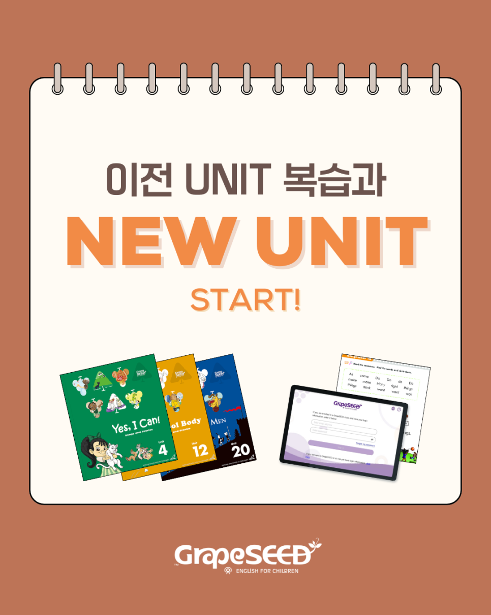 GrapeSEED를 하다 보면 첫 번째 유닛을 마치고 두 번째 유닛으로 넘어가 새로운 내용을 배우는 시기가 옵니다. 아이들이 재미있게 배우는 것도 중요하지만, 무엇보다 중요한 것은 이전 유닛 복습이에요!