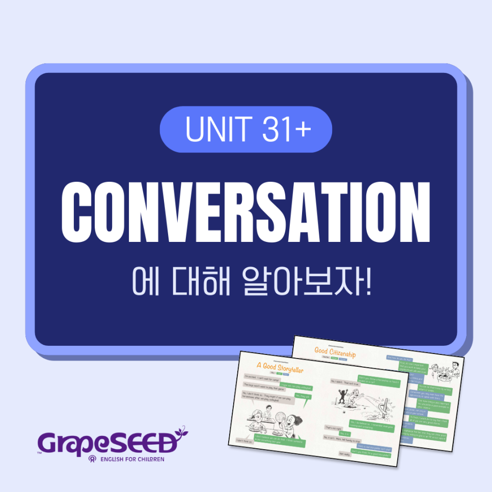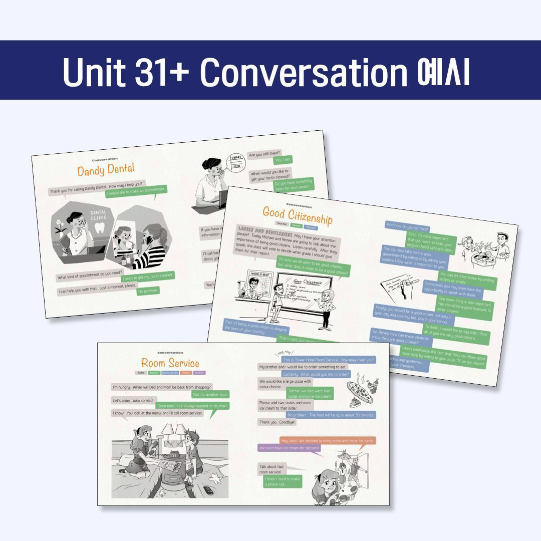 특히 초등 고학년 교육과정에서는 논리적으로 자신이 조사한 바 혹은 자신의 생각을 표현하는 프로젝트형 과제가 자주 주어지는데요. 이런 과제를 잘 수행하기 위해서는 영어 말하기 연습이 필수적이에요. 다양한 맥락에서의 표현들을 습득하기 위해, Unit 31부터는 대화형 수업 자료인 'Conversation'이 등장합니다.