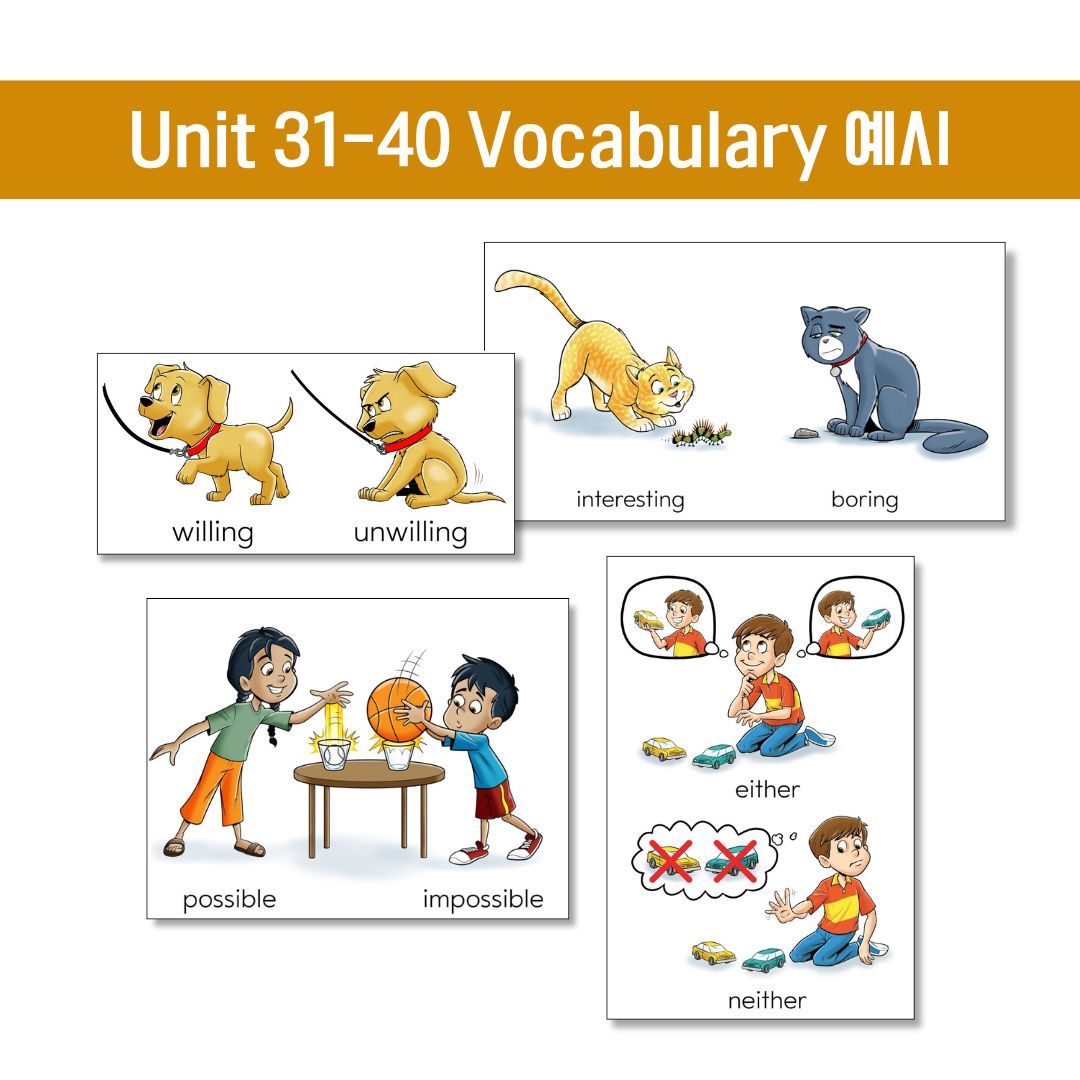 이렇게 Unit 31-40에서는 학생들이 다양한 방법으로 어휘를 배우고, 실제로 사용할 수 있는 능력을 키울 수 있도록 돕고 있어요. 연령과 언어 수준에 맞게 어휘력도 쑥쑥 확장해요!