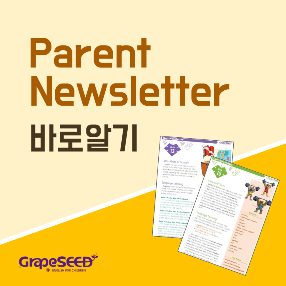 Parent Newsletter는 그레이프시드 수업에서 학생들이 Unit 별로 배우는 내용을 정리한 안내문입니다. 이 뉴스레터의 목적은 가정에서 자녀의 영어 습득에 관심을 갖고 함께 참여할 수 있는 정보를 전달하는 것입니다.