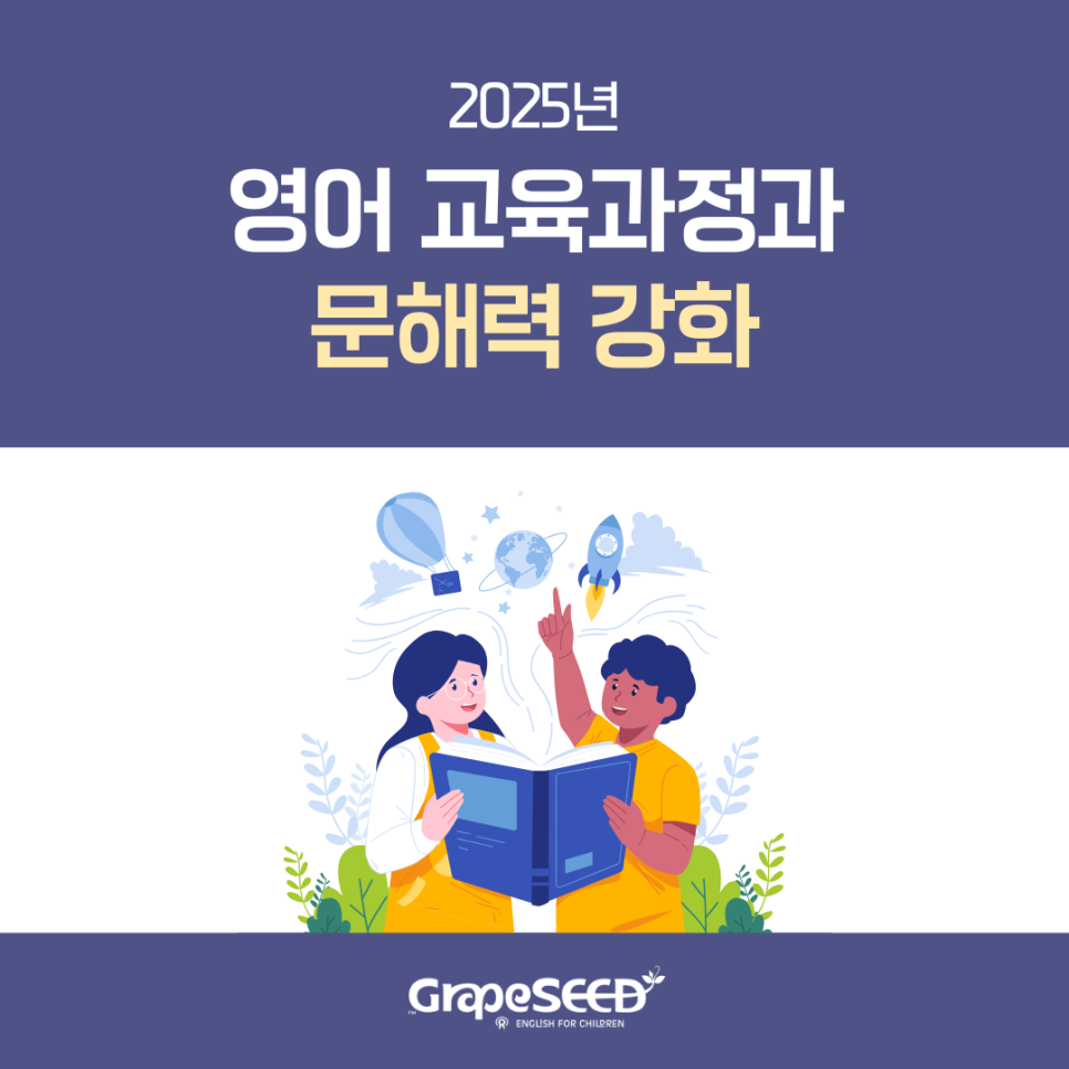 2025학년도 초등 영어 교과에 문해력 강화를 위한 많은 변화가 예상됩니다. 개정된 교육과정과 함께 새로운 변화를 경험할 초등 3,4학년 친구들을 그레이프시드가 응원합니다! 🎉
