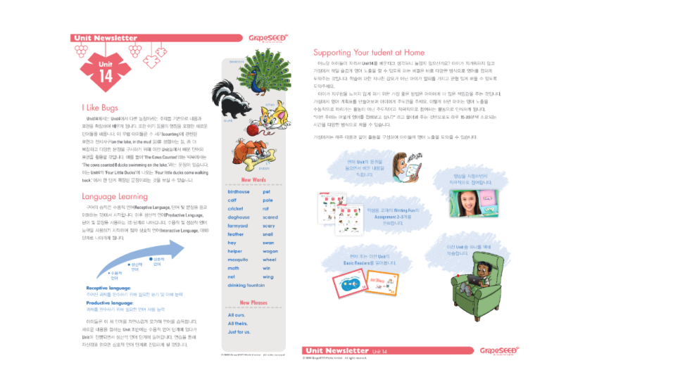 Unit Newsletter는 수업 시간에 배운 어휘, 표현 등과 함께 가정에서 적용할 수 있는 내용이 담겨 있어요. 수업 시간에 배운 어휘 및 표현을 가정에서 혹은 생활 속에서 접할 수 있는 소재와 접목하여 사용해 볼 수 있고 창의적인 활동을 통해 배운 내용을 오래 기억할 수 있지요. 매 Unit의 Newsletter를 꼭 확인하여 수업 시간에 배운 내용을 아이와 공유해 보세요!