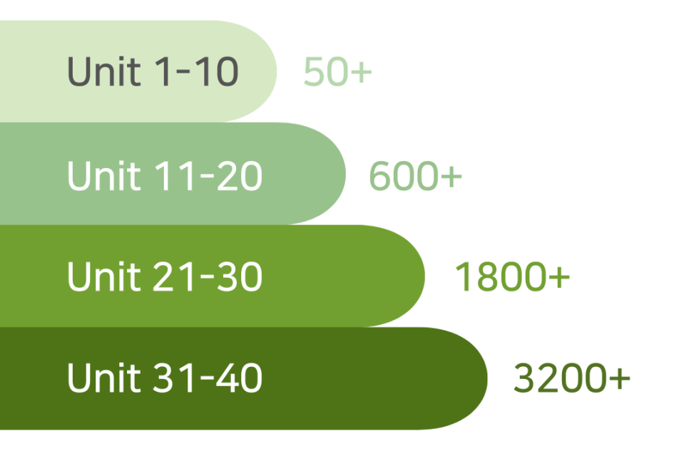 이러한 어휘 수의 증가는 아이들의 인지 발달과 함께 진행되며, 높은 유닛 단계에서는 읽을 수 있는 어휘 수가 말하고 쓸 수 있는 어휘 수보다 많아집니다.